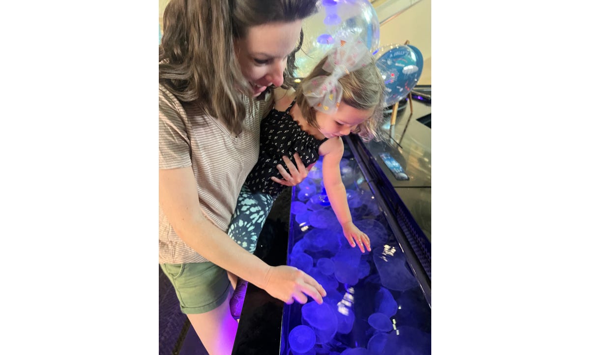 We even got to touch some moon jellies! They’re not venomous to humans and you can gently touch them on the tops of their bells. They were slimy and mushy, though a bit more solid than you might expect! Butterbean got a kick out of touching them too.